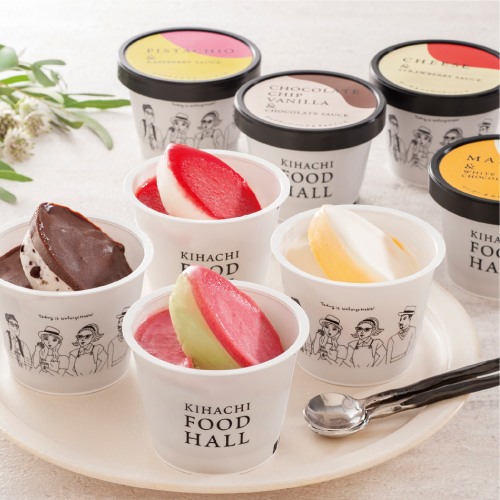 北海道の生クリームを使用したアイスクリームと、チョコやフルーツソースの相性を楽しめる2層仕立てのアイスクリーム。素材そのもののおいしさを引き出すKIHACHIならではの味わいです。